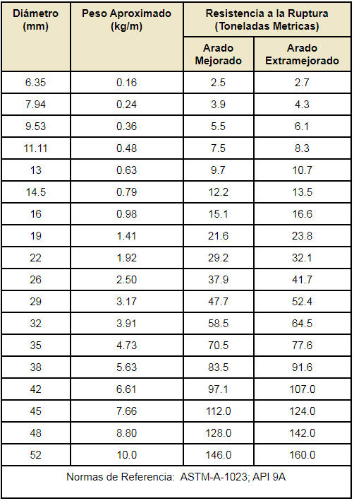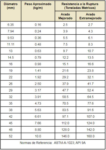 Tabla de Resistencias a la tension y Pesos (pulgadas)