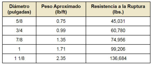 Tabla de Resistencias a la tension y Pesos (pulgadas)