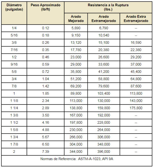 Tabla de Resistencias a la tension y Pesos (pulgadas)