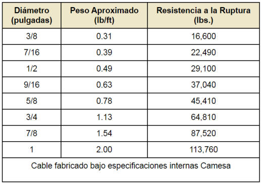 Tabla de Resistencias a la tension y Pesos (pulgadas)