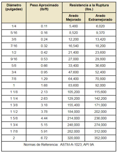 Tabla de Resistencias a la tension y Pesos (pulgadas)