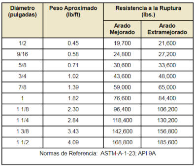 Tabla de Resistencias a la tension y Pesos (pulgadas)