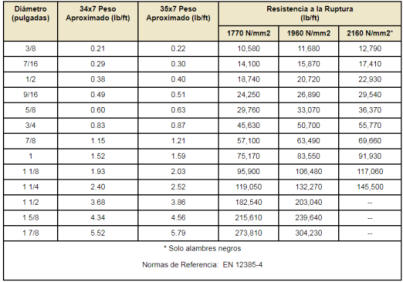 Tabla de Resistencias a la tension y Pesos (pulgadas)