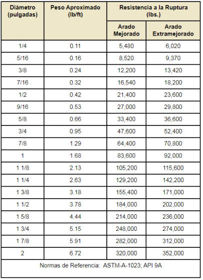 Tabla de Resistencias a la tension y Pesos (pulgadas)